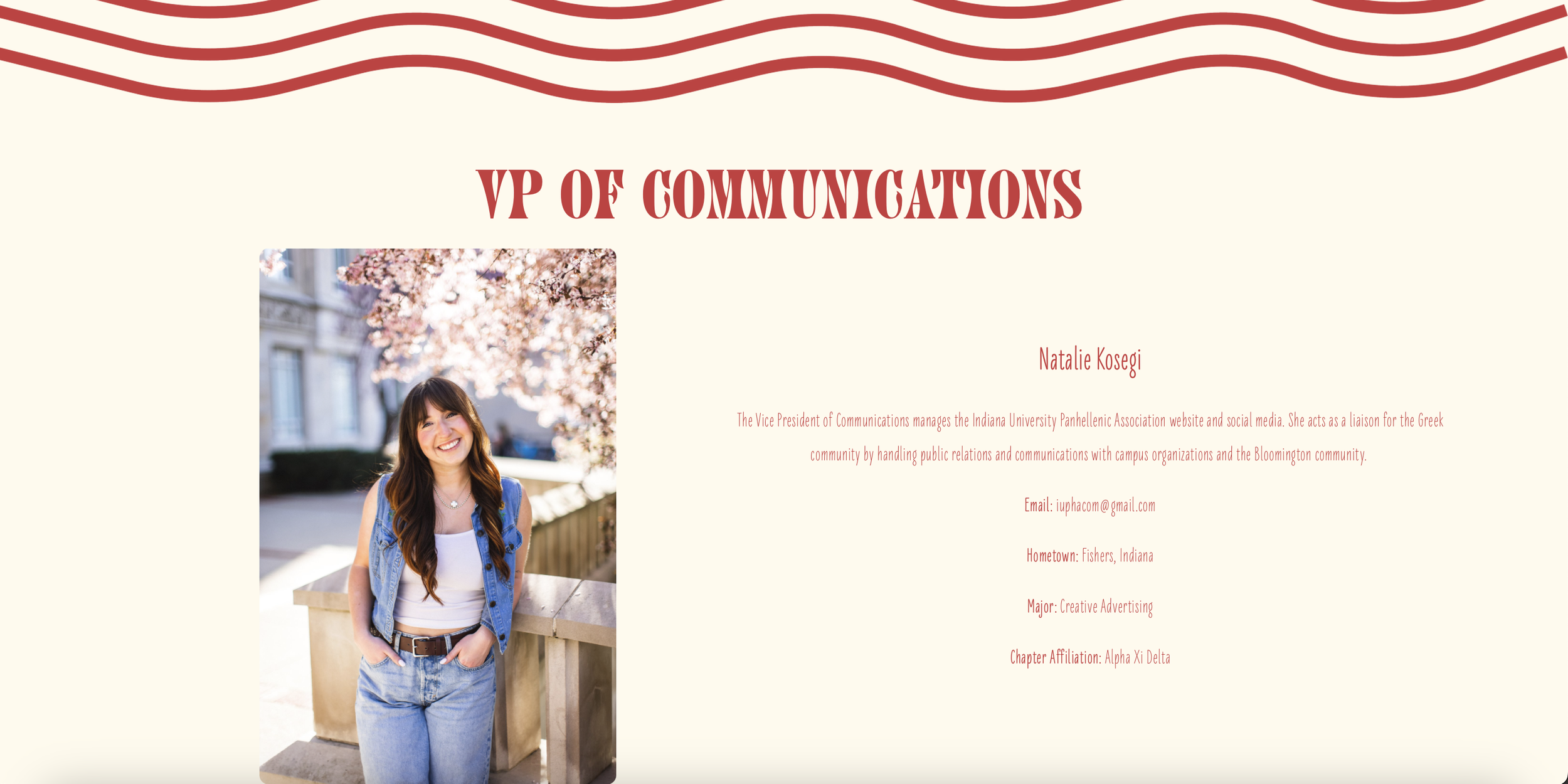 From January 2024 to January 2025 I served as the Vice President of Communications for the Panhellenic Association at Indiana University.